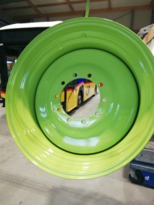 Hier erstrahlen Traktorfelgen in neuen Farben.